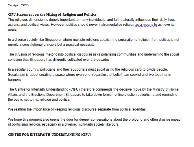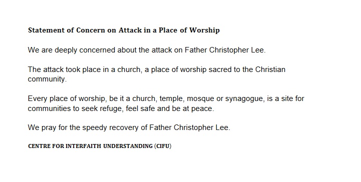Media Release 18 April 2025 Statement on Mixing of Religion and Politics 19 November 2024 Statement of Concern on Attack in a Pace of Worship 18 October 2023 Statement of Concern For Peace, Justice And Compassion To Prevail Read More 21 August 2022 Statement in Support of Repealing 377A and Affirming Freedom of Religion and/or Belief Read More 10 March 2021 Statement against antisemitism and other forms of hate Read More 27 January 2021 Call for vigilance against extremist views Read More 30 October 2020 Call for dialogue and compassion when responding to offensive speech/act Read More
